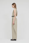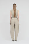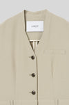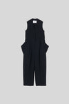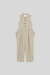 軽やかな素材感が、構築的なデザインの中にリラックスしたムードをもたらします。上身頃はコンパクトなジレデザインに仕立て、ボトムには誇張したポケットを配置。裾に向かって緩やかに窄まるフォルムが、立体感のある洗練されたシルエットを描きます。