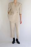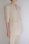 Using 100% dry-touch gully wool yarn, we use a material with a characteristic quality that feels men's-like power. A constructive and three-dimensional silhouette is possible due to the tight flesh. The no-color middle sleeve is a piece that gives you a sharp silhouette that has been cultivated.