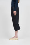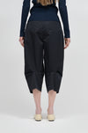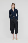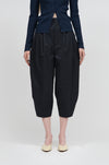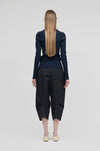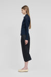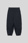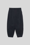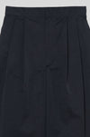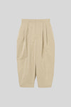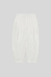 膝裏に施したタックが立体的なフォルムを生み出し、すっきりと縦のラインを活かした端正なシルエットを形成。生地表面に施された自然な皺加工が奥行きのある表情を添え、素材の軽やかさをさりげなく引き立てます。