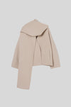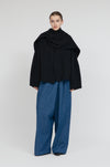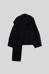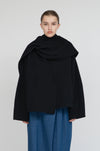 襟元に大判ストールのデザインが施された立体的な丸いフォルムのウールコート。
