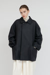 クラシックなステンカラーコートをベースに、襟や袖口の裏にアクセントとなる本革を使用しており、ミニマルなデザインの中にテクニックが光る逸品。