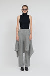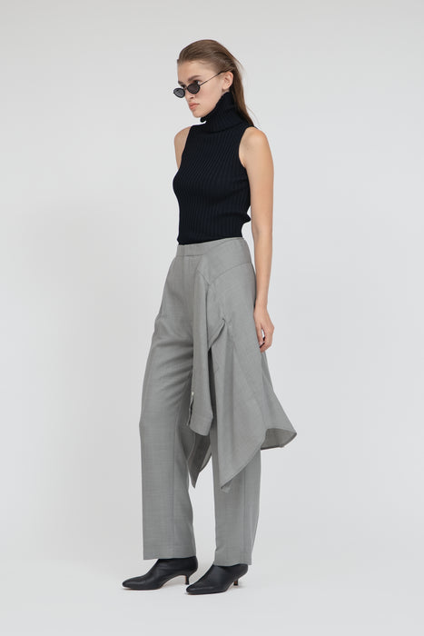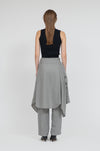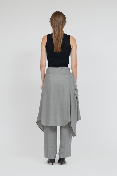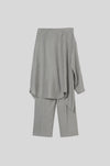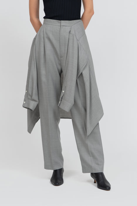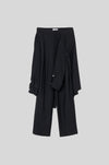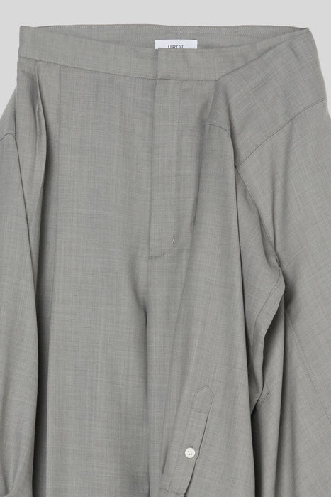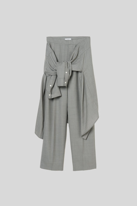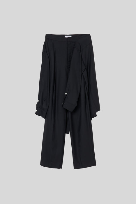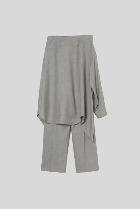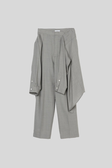 ウールながらシルクの風合いを感じるほのかな張りと、独特な落ち感が美しい一着。スラックスにシャツを腰位置でドッキングさせた遊び心を込めたデザインは、新しいスタイリングを可能にするニューボトムです。