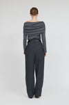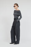 裾に向かってダイナミックに直下したテーパードシルエットは、素材感とパターン設計が見事にマッチし、構築的な設計で洗練された印象に仕上げています。