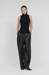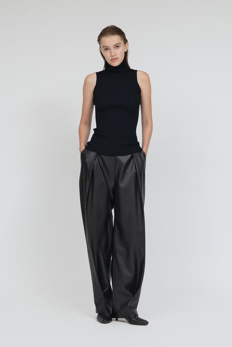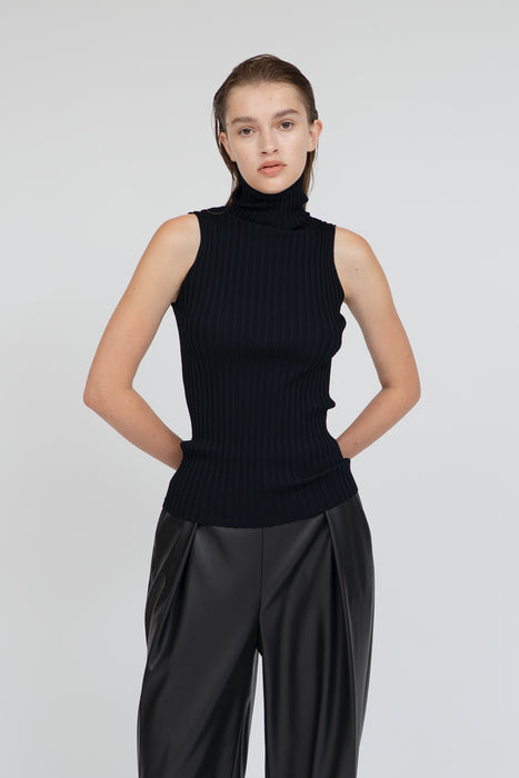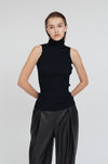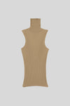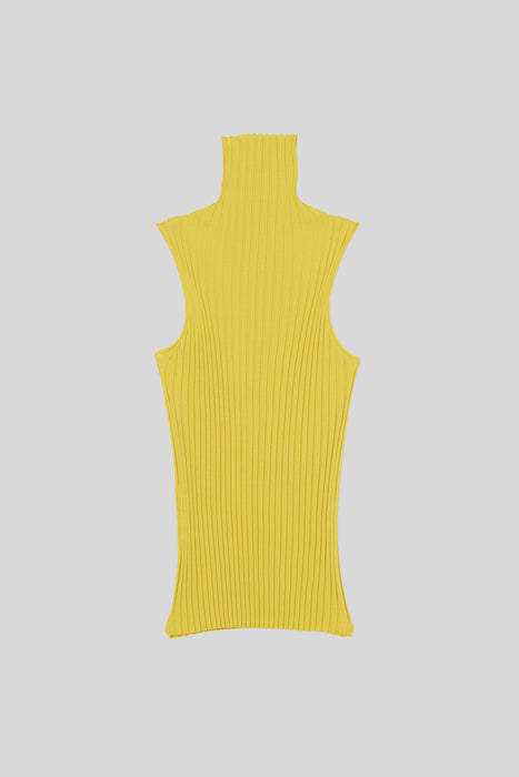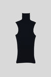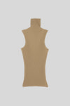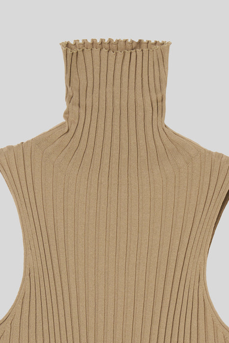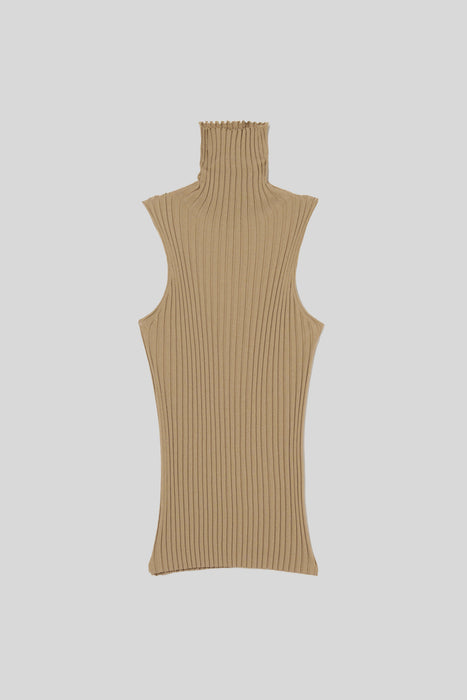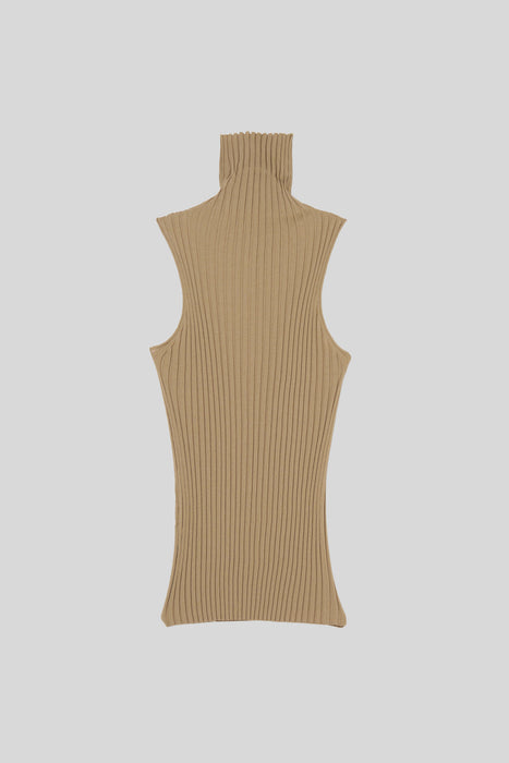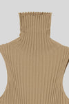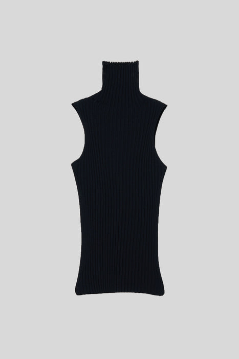 ショルダーとネックラインを美しく魅せる絶妙なサイジングと、伸縮性のある太リブで編み立てた、絶妙なフィット感とコンパクトな身頃のスリーブレスニット。